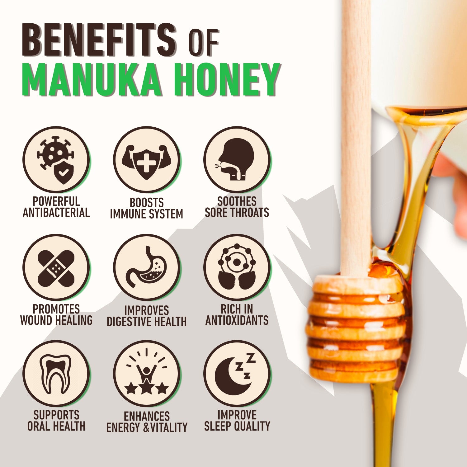 - Immune System Support – Contains Organic Manuka Honey MGO +263, known for its superior antibacterial and antioxidant properties to fortify immune health and support overall wellness.